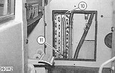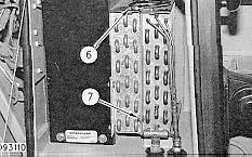 7. Loosen and remove two hold down clamps (9). Remove bracket (10) from front of battery (6).