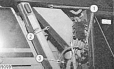 3. Remove two bolts, and washers (3) and remove the air conditioning accumulator (2).