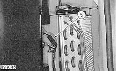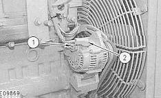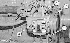 1. Loosen bolts (1) and (2). Move alternator (4) towards the engine and remove two Vee belts (3).