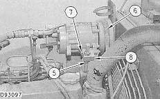 4. Loosen nut (5) to release tension from vee belt (6). Remove bolt (7), washer and nut holding adjuster block (8) to the compressor.