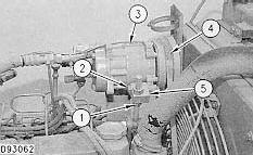 1. Loosen nut (1) to release tension from belt (4). Remove bolt (2), washer and nut holding adjusting block (5) to the air conditioning compressor (3).