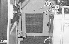 5. Remove two bolts (8) and remove windshield washer bottle (9) from machine.