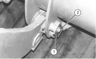 4. Install bolts (2) onto bucket pins (1) on each arm. Tighten bolts(2) to a torque of 360 ± 50 N·m (266 ± 37 lb ft). Install the grease fittings into the pins and use a grease gun in order to put new grease in the pins.