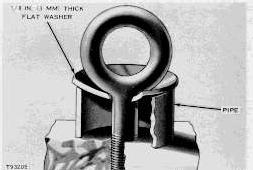 When it is necessary to remove a component on an angle, remember that the capacity of an eyebolt diminishes as the angle between the supporting members and the object becomes less than 90°. Eyebolts and brackets should never be bent and should only have stress in tension. A length of pipe and a washer can be used, as shown, to help relieve these stresses on eyebolts.