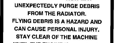 Thismachineisequippedwithanenginefanthatmay unexpectedlypurgedebrisfromtheradiator.Flyingdebrisisa hazardandcancausepersonalinjury.Stayclearofthemachine untiltheengineisstopped.