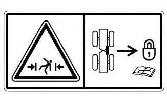 CrushingHazard.Thereisnoclearanceforapersoninthisarea whenthemachineturns.Severeinjuryordeathfromcrushing couldoccur.Connectthesteeringframelockbetweenfrontand rearframesbeforelifting,transporting,orservicingthemachine inthearticulationarea.