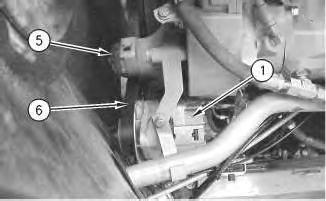 8. Remove two pivot bolts (7) from alternator (1). Remove the alternator.