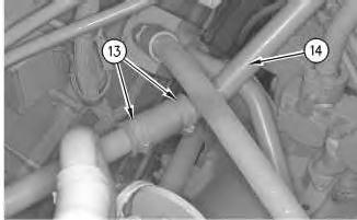 9. Loosen hose clamps (13). Remove the hose from dust ejector tube (14) .