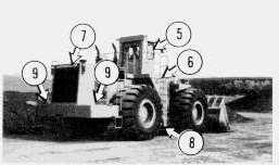 Operator'scompartment(5),hydraulictank(6),radiator(7),transmission(8),andbattery(9).