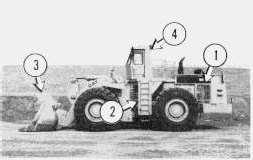 Engine(1),fueltank(2),bucket(3),andcab(4).