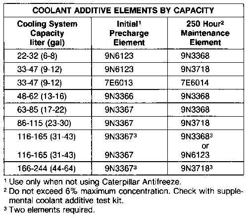 Alwaysaddsupplementalcoolantadditiveorequivalenttothecoolant, orinstallaCaterpillarsupplementalcoolantadditiveelement(if equipped).Neverusecoolantonly,exceptifCaterpillarAntifreezeis beingusedwhichcontainstheadditive.Inthiscase,nosupplemental coolantadditiveisneededoninitialfill,butisnecessaryona maintenancebasis.