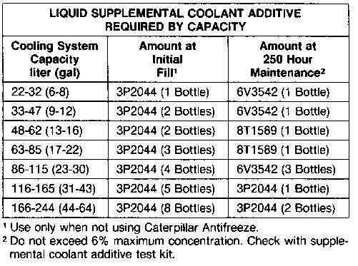 OninitialfillofaneworreconditionedengineifCaterpillarAntifreezeisnotused,add1liter(1 quart)ofsupplementalcoolantadditive,orequivalent,foreach30liters(8U.S.gallons)sothat thecoolingsystemwillhavea3%to6%concentrationofsupplementalcoolantadditive.