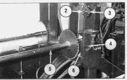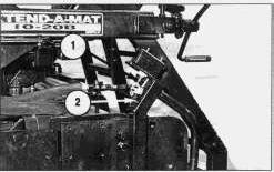 1. Loosen the tension on crown chain (1) by adjusting bolt (2).