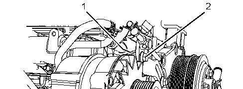 2. Loosen locking nut (2) and alternator tensioning bolt (1).