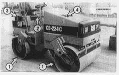 VibratoryDrum(1),Operator'sStation(2),WaterTank(3),FuelTank(underaccesscover)(4).