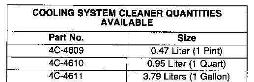 CaterpillarCoolingSystemCleanersaredesignedtocleanthesystemofharmfulscaleandcorrosion. Itdissolvesmineralscale,corrosionproducts,lightoilcontaminationandsludge.Coolingsystem cleanersareavailablefromyourCaterpillardealerinthequantitieslisted.Followthelabeldirections forproperusage.