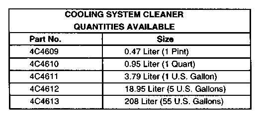 CaterpillarCoolingSystemCleanersaredesignedtocleanthesystemofharmfulscaleand corrosion.Mineralscale,corrosionproducts,lightoilcontaminationandsludgeisdissolved. CoolingsystemcleanersareavailablefromyourCaterpillardealerinthequantitieslisted.Follow thelabeldirectionsforproperusage.
