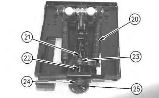 13. Install nut (23), weight adjustment screw (22), two races, the thrust bearing, weight adjustment knob (25) and pin (24). Turn weight adjustment knob (25) in the positive (+) direction in order to apply tension to springs (20). Install pin (21) in the end of weight adjustment screw (22) .