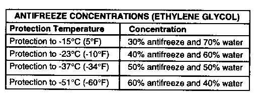 Checkthespecificgravityoftheantifreezesolutionfrequently incoldweathertoensureadequatefreezeprotection.Premix coolantsolutiontoprovideprotectiontothelowestexpected outside(ambient)temperature.Pureundilutedantifreezewill freezeat-23°C(-10°F).