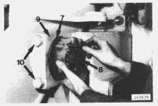 Shims (7) are installed between the bearing cap (8) and the front suspension frame (9). If adjustment is necessary remove shims from under one bearing cap and install the same shims under the bearing cap on the other side. Before carrying out adjustment slacken clamp bolts (10). Tighten fully after adjustment.