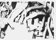 17. D400 - Remove the bolts securing the torque converter valve group (22) to the transmission mounting bracket. Disconnect the valve group oil supply line (24). Move the valve group to allow clearance when the transmission and output transfer drive assembly is hoisted out of the compartment. Remove the oil filler tube assembly (25). Disconnect the remaining oil lines (26) and (27) from the front of the transmission. Disconnect the oil cooler return line (23).