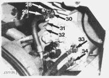 18. C Trucks - Disconnect the oil lines (28-34) from the front of the transmission. Mark the oil lines to ensure correct reconnection. Plug the ports and cap the hoses to reduce oil spillage and prevent contamination.