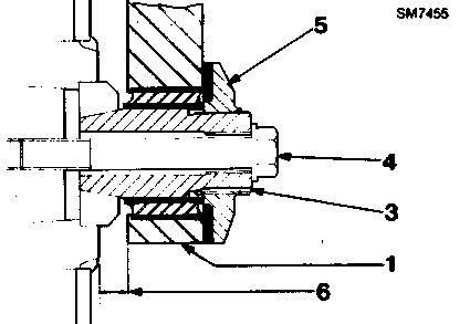 6. Install the locating ring (5). Use tool 6V3133 Spanner Wrench to tighten the locating ring until it just touches the face of the mounting bracket (1). Measure the gap (6) on each side of the truck and adjust the locating rings until both dimensions are equal to within 2mm.