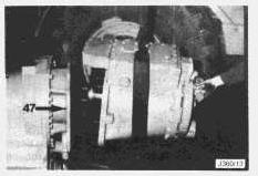 30. Attach a sling and hoist to the transmission. Install two 3/8 - 16NC forcing bolts (47) to separate the transmission from the output transfer drive. Remove the transmission from the output transfer drive. The weight of the transmission is 622 kg (1370 lb.).