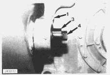 5. Install the bolts (4) and washers and tighten to a torque setting of 360±47 Nm (265±35 lb.ft.).