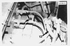 10. Trucks fitted with supplementary steering: Remove the supplementary steer hoses (10 and 11) from the diverter valve (12) to the pipes (13) and (14). Plug the ports on the diverter valve and cap the hoses to prevent contamination.
