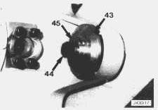 26. Drill out the indented lip of the locating ring (43) and remove the locating ring using tool 6V3133 Spanner Wrench. Remove the bolts (44) from the left and right hand pivot pins. Remove the pivot pins (45).