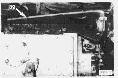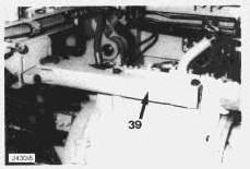 22. Remove the bolts securing the upper transmission mounting assembly (39). Remove the mounting assembly. Remove the torque converter selector valve (40) to provide more clearance.