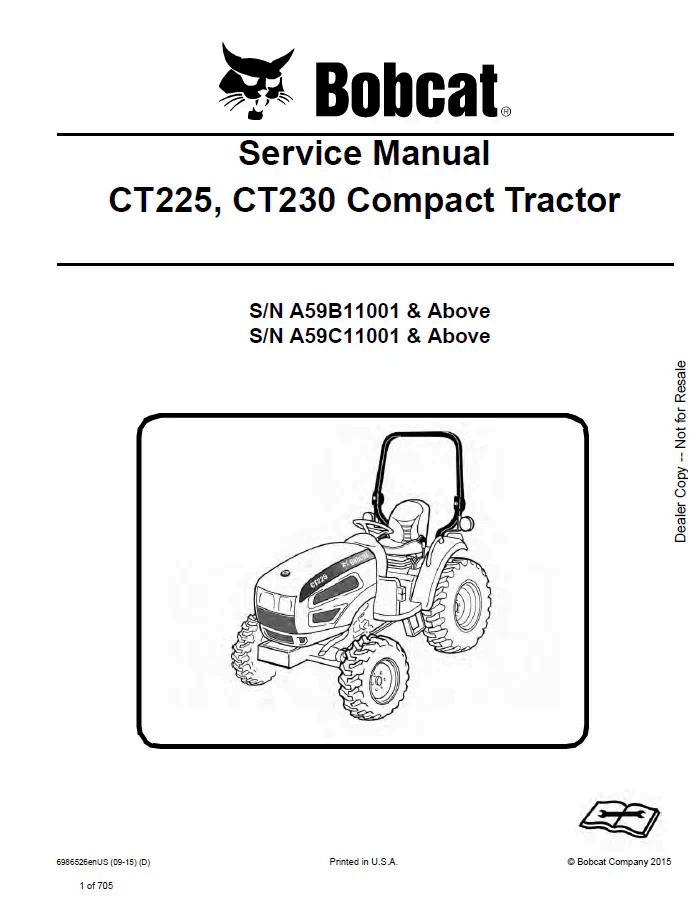 Comprehensive service manual for Bobcat CT225 and CT230 compact tractors in PDF format. This technical resource covers detailed maintenance procedures, troubleshooting guides, parts diagrams, and repair specifications essential for operators and technicians. Access complete information on engine systems, hydraulics, transmission, electrical components, and routine service intervals. Ideal for equipment owners seeking reliable documentation to maintain peak performance and extend machine longevity.