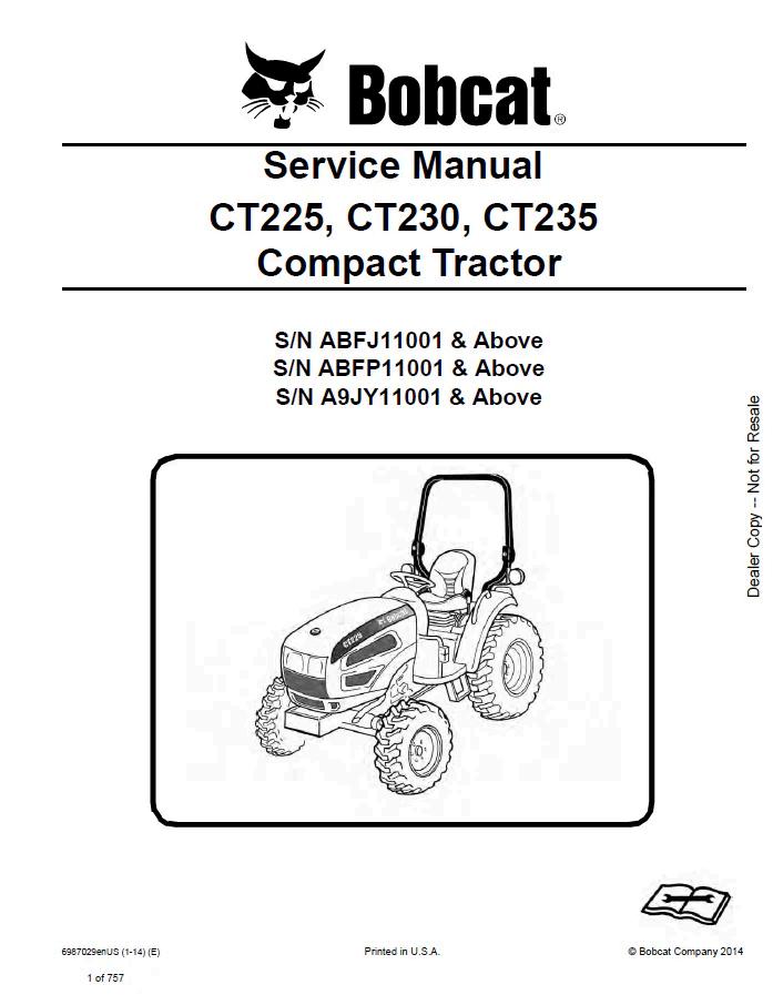 Comprehensive service manual for Bobcat CT225, CT230, and CT235 compact tractors. This detailed PDF guide covers maintenance procedures, troubleshooting, repair specifications, and component diagrams essential for technicians and operators. Includes engine systems, hydraulics, transmission, electrical components, and safety protocols. Ideal for workshop professionals and equipment owners requiring reliable technical documentation for efficient machine servicing and diagnostics.