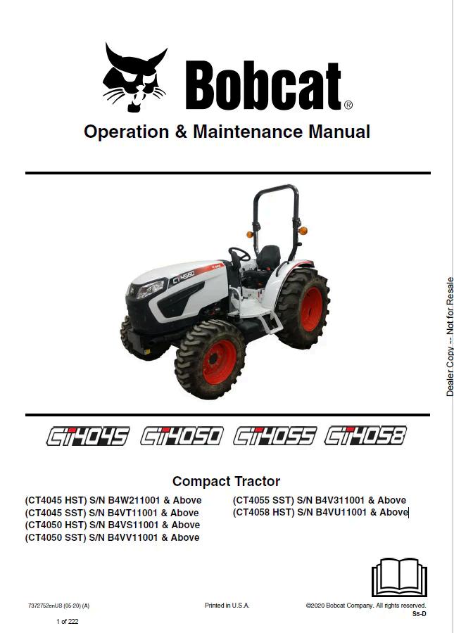 This comprehensive operation and maintenance manual covers the complete Bobcat CT compact tractor lineup, including HST and SST transmission models. Designed for operators and technicians, it provides detailed guidance on equipment operation, routine maintenance procedures, troubleshooting, and service specifications. The manual ensures optimal performance and longevity of your CT4045, CT4050, CT4055, and CT4058 tractors. Essential reference documentation for proper equipment management and compliance with manufacturer recommendations.