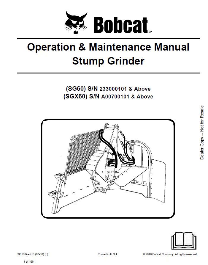 Comprehensive service manual for Bobcat SG60 and SGX60 stump grinders. This detailed PDF guide covers maintenance procedures, troubleshooting, parts identification, and repair specifications essential for equipment operators and technicians. Access critical information on engine systems, hydraulic components, grinding mechanisms, and safety protocols. Ideal for ensuring optimal performance and extending equipment lifespan through proper maintenance and timely repairs.