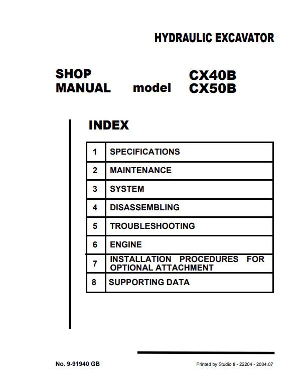 Comprehensive service and repair manual for Case CX40B and CX50B hydraulic excavators, document number 9-91940. This technical guide provides detailed specifications, diagnostic procedures, maintenance schedules, and step-by-step repair instructions for both models. Essential resource for technicians, operators, and equipment managers requiring factory-authorized documentation. Covers hydraulic systems, engine components, electrical circuits, and structural assemblies. Digital PDF format enables quick reference and searchability for efficient troubleshooting and preventive maintenance planning.