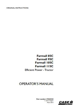 Case IH Tractor Farmall 85C, 95C, 105C, 115C Operator Manual (47604538) provides comprehensive guidance for safe and efficient equipment operation. This official PDF manual covers all essential procedures including startup, maintenance schedules, hydraulic system operation, and troubleshooting protocols. Designed for operators and technicians, it delivers detailed specifications and step-by-step instructions to maximize productivity while minimizing downtime. An indispensable reference for anyone managing these versatile utility tractors in agricultural or commercial applications.