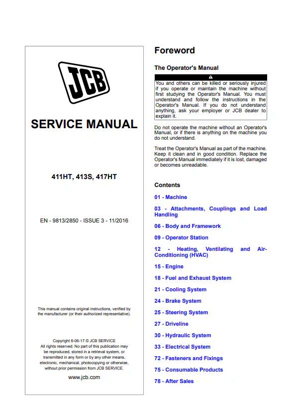 JCB 411HT, 413S, and 417HT Service Manual (9813/2850) in PDF format. This comprehensive technical documentation provides detailed repair, maintenance, and troubleshooting procedures for these telehandler models. Essential resource for technicians, operators, and fleet managers requiring factory-authorized service information. Covers diagnostics, component specifications, and step-by-step repair instructions. Instant digital download ensures immediate access to critical maintenance data for optimal equipment performance and longevity.