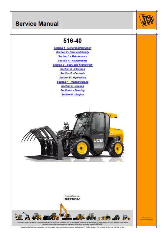 JCB 516-40 Service Manual 9813/4600-1 PDF Comprehensive service documentation for the JCB 516-40 telehandler, reference 9813/4600-1. This manual provides detailed technical specifications, maintenance procedures, troubleshooting guides, and component diagrams essential for qualified technicians and equipment operators. Covers routine servicing, repair protocols, and parts identification to ensure optimal performance and longevity of your JCB 516-40. Digital PDF format enables quick access to critical information on-site or in the workshop. Ideal for fleet managers, service centers, and equipment maintenance professionals requiring authoritative JCB technical guidance.