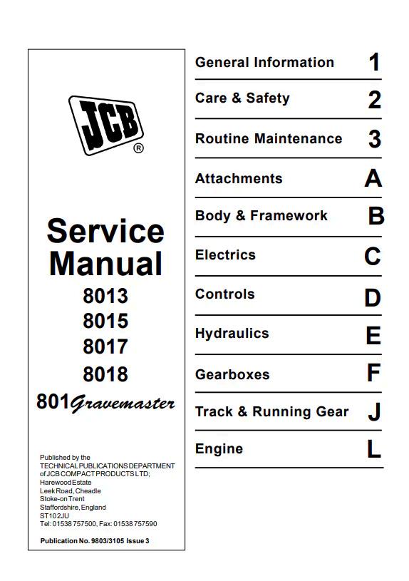 JCB 801 Series Service Manual covering models 8013, 8015, 8017, and 8018. This comprehensive technical documentation (reference 9803/3105) provides detailed repair, maintenance, and troubleshooting procedures for mini excavators. Essential resource for technicians, operators, and equipment managers requiring factory-authorized service information. Includes specifications, component diagrams, and step-by-step guidance for optimal equipment performance and longevity. Digital PDF format for immediate access and convenient reference.