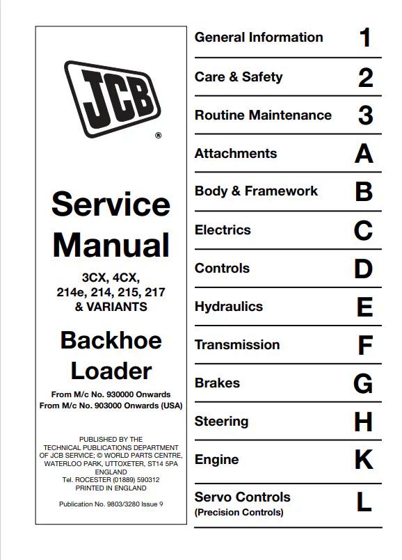 JCB Backhoe Loader 3CX, 4CX, 214e, 214, 215, 217 & Variants Service Manual 9803/3280 PDF Comprehensive service documentation covering the complete JCB backhoe loader lineup. This manual (reference 9803/3280) provides detailed technical specifications, maintenance procedures, troubleshooting protocols, and repair instructions for all listed models and their variants. Essential resource for technicians, operators, and fleet managers requiring authoritative guidance on equipment servicing, diagnostics, and performance optimization. Digital PDF format ensures immediate access to critical information for minimizing downtime and maintaining operational efficiency across your heavy equipment fleet.
