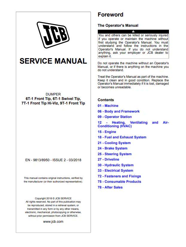 Comprehensive service manual for JCB dumper models including 6T-1 Front Tip, 6T-1 Swivel Tip, 7T-1 Front Tip Hi-Viz, and 9T-1 Front Tip variants. Document reference 9813/8950 provides detailed technical guidance for maintenance, troubleshooting, and repair procedures. Essential resource for operators, technicians, and fleet managers requiring authentic factory documentation. PDF format enables quick access to specifications, component diagrams, and service intervals across all covered dumper configurations.