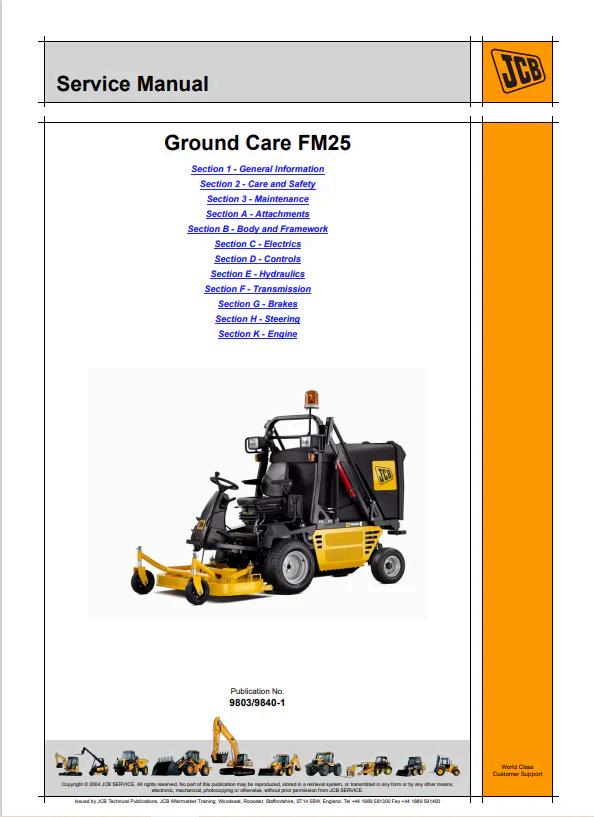 JCB Ground Care FM25 Service Manual 9803/9840-1 PDF Comprehensive service documentation for the JCB FM25 ground care equipment, covering models 9803 and 9840-1. This technical manual provides detailed maintenance procedures, troubleshooting guidance, component specifications, and repair protocols essential for qualified technicians and equipment operators. Access critical information on hydraulic systems, engine maintenance, blade adjustments, and seasonal servicing requirements. Ideal for workshop professionals managing fleet maintenance schedules and ensuring optimal equipment performance. Digital PDF format enables quick reference and easy distribution across your service team.