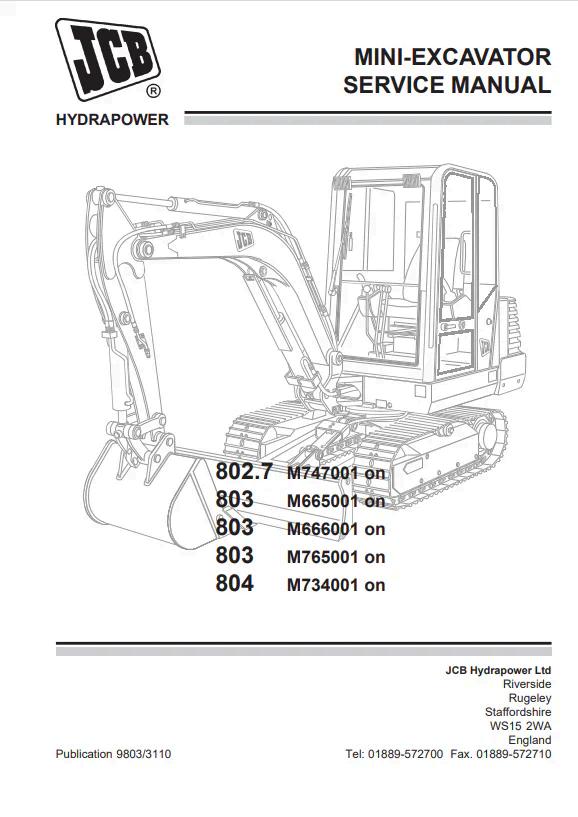 JCB Hydrapower 802.7, 803, and 804 Service Manual (Reference 9803/3110) in PDF format. This comprehensive technical documentation provides detailed maintenance, troubleshooting, and repair procedures for Hydrapower mini excavator models. Essential resource for technicians, operators, and service centers requiring factory-authorized guidance on component inspection, hydraulic systems, engine maintenance, and mechanical adjustments. Digital format ensures convenient access to specifications and service intervals.