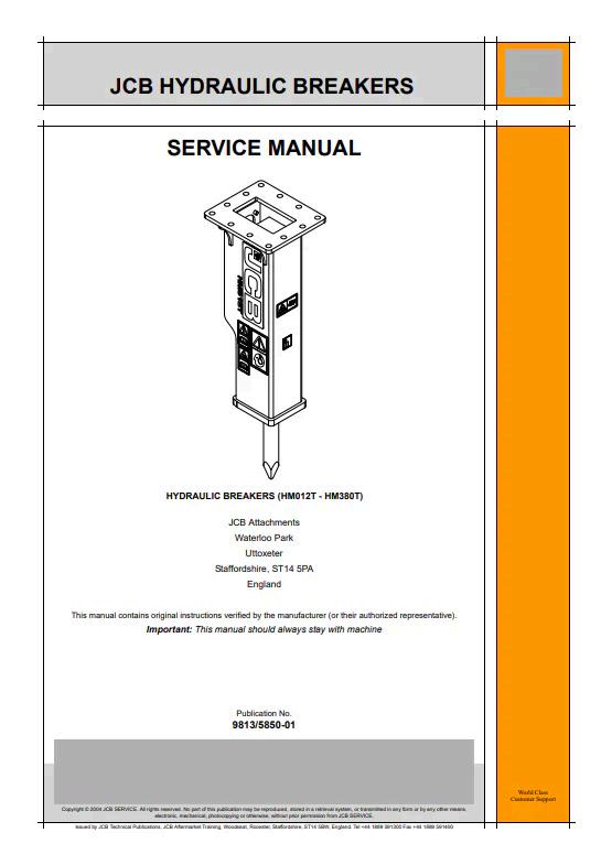 JCB Hydraulic Breakers HM012T - HM380T Service Manual 9813/5850-01 PDF Comprehensive service documentation for JCB hydraulic breaker models HM012T through HM380T. This official manual (reference 9813/5850-01) provides technicians and operators with detailed maintenance procedures, troubleshooting protocols, and component specifications. Essential resource for equipment upkeep, repair operations, and optimal performance management across the full HM series range.
