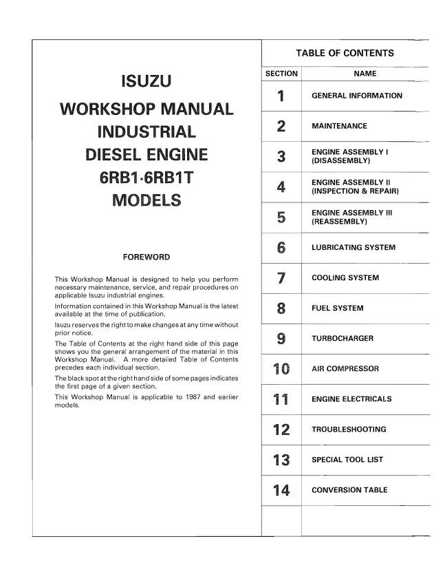 JCB ISUZU Diesel Engine 6RB1, 6RB1T Model Workshop Manual PDF Comprehensive technical documentation for JCB ISUZU 6RB1 and 6RB1T diesel engines. This workshop manual provides detailed specifications, maintenance procedures, troubleshooting guides, and repair instructions essential for technicians and operators. Access complete engine schematics, torque specifications, and service intervals. Ideal for workshop professionals, equipment operators, and maintenance teams requiring authoritative reference material for these industrial diesel powerplants.