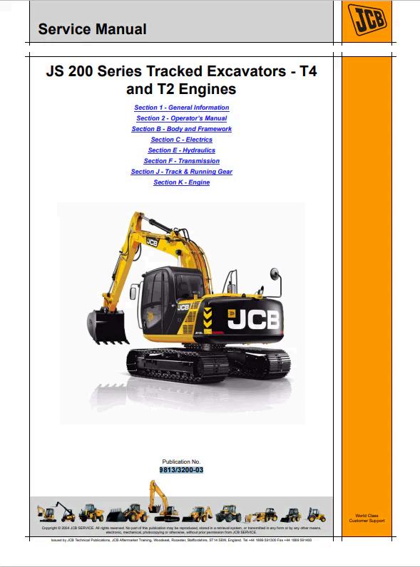JCB JS 200 Series Tracked Excavator T4 and T2 Engine Service Manual 9813/3200-03 PDF Comprehensive service documentation for JCB JS 200 Series tracked excavators equipped with T4 and T2 engines. This official manual (reference 9813/3200-03) provides detailed maintenance procedures, troubleshooting guidance, and technical specifications essential for equipment operators and service technicians. Covers engine diagnostics, component servicing, and performance optimization. Digital PDF format enables quick access to critical information for field and workshop reference. Ideal for fleet managers, maintenance teams, and authorized dealers requiring authoritative technical guidance.