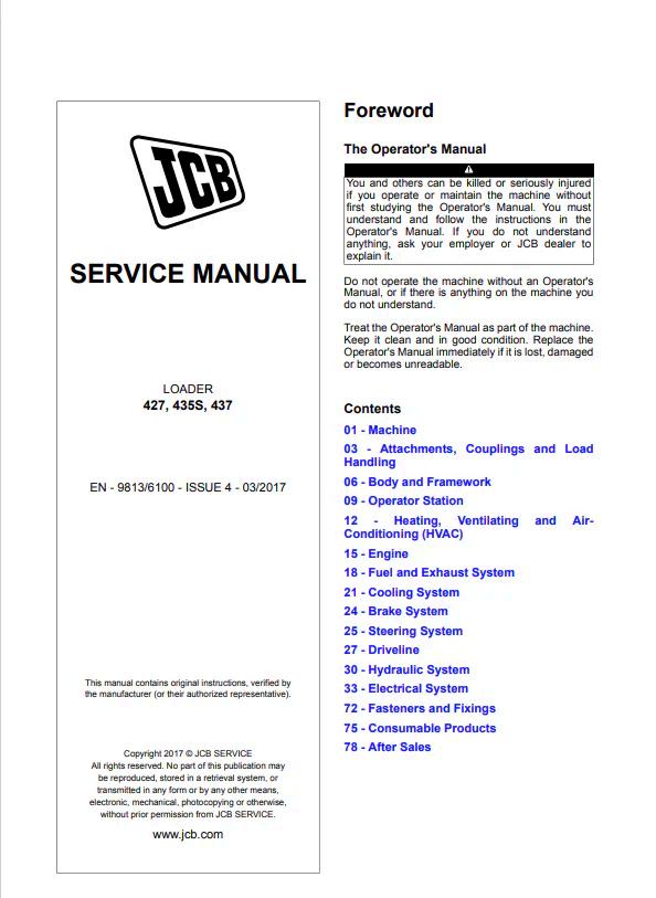 JCB Loader 427, 435S, 437 Service Manual 9813/6100 PDF Comprehensive service documentation for JCB wheel loaders covering models 427, 435S, and 437. This official manual (reference 9813/6100) provides detailed technical specifications, maintenance procedures, troubleshooting guides, and repair instructions. Essential resource for technicians, operators, and fleet managers requiring in-depth knowledge of these loader systems. Digital PDF format enables quick access to critical information for efficient equipment servicing and diagnostics.