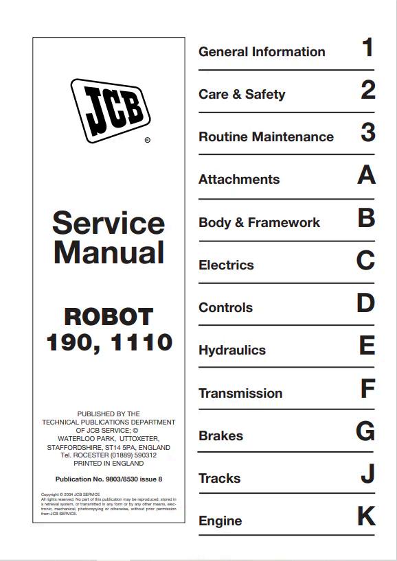 JCB Robot 190 and 1110 Service Manual (Reference 9803/8530) provides comprehensive technical documentation for maintenance, repair, and operation of these compact loader models. This PDF manual includes detailed specifications, troubleshooting procedures, hydraulic schematics, electrical diagrams, and step-by-step service instructions. Essential for technicians, operators, and fleet managers requiring authentic factory guidance. Covers engine systems, transmission, hydraulics, and component replacement protocols. Ensure equipment reliability and optimal performance with this authoritative service resource.